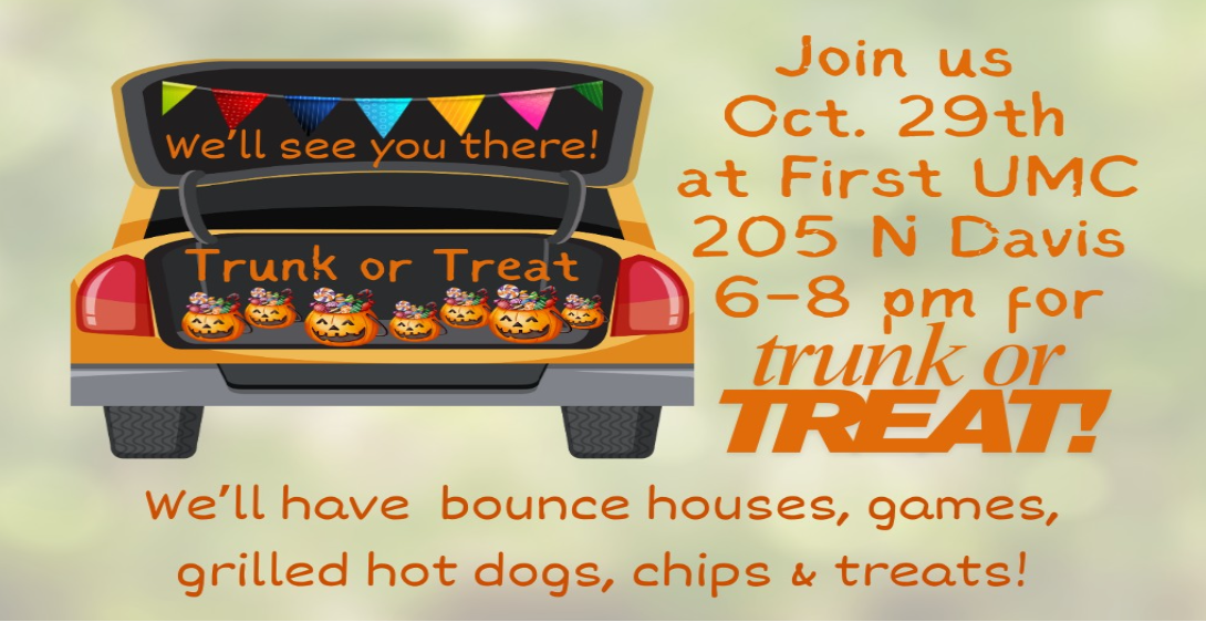 It’s time for Trunk or Treat Fall Festival once again! Join us for this free event on October 29th from 6:00—8:00 pm. This event will replace our regular Wednesday Night Supper! We will have grilled hot dogs, chips and a treat. Games, pumpkins, candy and bounce houses will consume the evening as we fellowship with our First family and our community of guests! Spread the word! Of course, your talents and gifts are needed! Your decorated trunks, hosted games, food serving and mingling skills are always welcome!